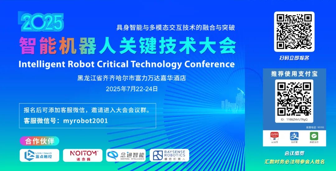 1.會(huì)議注冊(cè)費(fèi): 2.參會(huì)人員須提前繳費(fèi)至如下會(huì)議指定賬戶: 附言:參會(huì)人姓名+單位+robot2025 3.會(huì)議注冊(cè)(以下方式二選一) (1)掃描下方二維碼在線注冊(cè)報(bào)名,并進(jìn)行繳費(fèi) 立即報(bào)名,共赴行業(yè)盛會(huì)! (2)PC端會(huì)議注冊(cè)報(bào)名: 通過(guò)“機(jī)器人科學(xué)網(wǎng)”(www.intronix.cn)-參會(huì)報(bào)名-2025智能機(jī)器人關(guān)鍵技術(shù)大會(huì)參會(huì)報(bào)名”進(jìn)行報(bào)名,并繳納注冊(cè)費(fèi)。 注冊(cè)成功并完成繳費(fèi)后,請(qǐng)?zhí)顚懕净貓?zhí)并發(fā)送至郵箱:786390111@qq.com 報(bào)名截止時(shí)間:2025年07月21日 17:00:00 4.注意事項(xiàng) 1)注冊(cè)報(bào)名是否成功以繳費(fèi)后收到短信或郵件確認(rèn)為準(zhǔn); 2)會(huì)議注冊(cè)費(fèi)含會(huì)議期間2個(gè)午餐(23日午餐和24日午餐)和2個(gè)晚餐(22日晚餐和23日晚餐),以及會(huì)議資料費(fèi)。大會(huì)期間住宿和交通費(fèi)自理; 3)注冊(cè)費(fèi)由艾笛特(杭州)網(wǎng)絡(luò)科技有限公司收取并開具發(fā)票; 4)學(xué)生包括全日制在校本科、碩士及博士研究生,報(bào)名時(shí)須上傳學(xué)生證; 5)退費(fèi)事宜:如參會(huì)代表因故缺席,需退會(huì)議注冊(cè)費(fèi),請(qǐng)?jiān)跁?huì)議召開7天前,以書面或電子郵件形式向會(huì)務(wù)組申請(qǐng)退款,會(huì)務(wù)組收到申請(qǐng)后將于會(huì)議結(jié)束后10個(gè)工作日內(nèi)完成退款手續(xù),退款產(chǎn)生的轉(zhuǎn)賬手續(xù)費(fèi)由代表本人承擔(dān)。會(huì)后不接收代表的退款申請(qǐng)。
