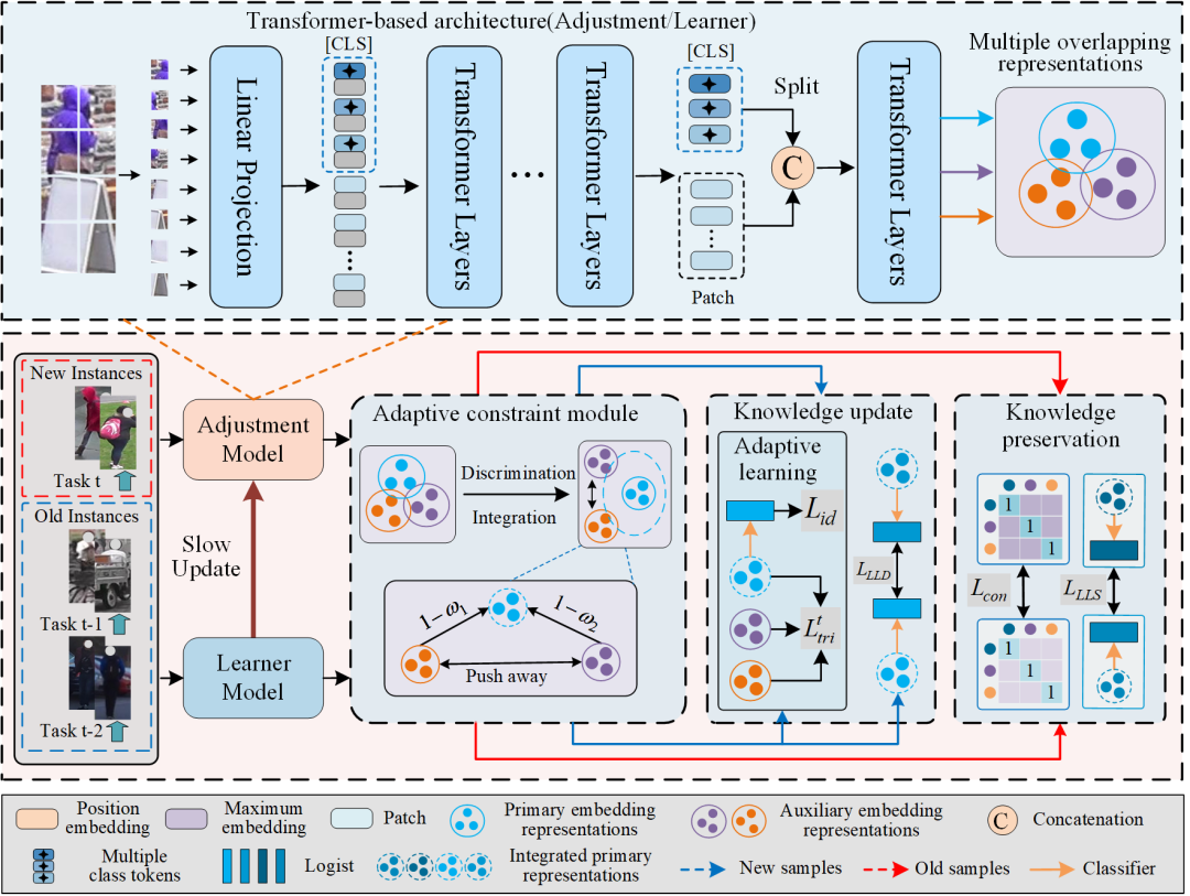 多樣化表征嵌入的終身行人重識別算法框架 跨場景持續行人重識別技術,是目標檢測和目標跟蹤的重要環節,通過從連續的數據流中不斷學習,隨著時間的推移進行非重疊相機檢索相同身份的行人。該項技術可用于視頻監控、智能安防、多機協同檢測等場景。 然而,在跨場景持續行人重識別任務中,往往存在著任務間隔閡和模型表征能力受限等問題,限制了模型在舊知識抗遺忘與新信息自適應學習之間的平衡能力。 近日,中國科學院沈陽自動化研究所機器人學研究室機器智能研究組科研團隊提出了一種多樣化表征嵌入框架,可有效地提升模型的抗遺忘和自適應學習能力。該框架采用基于Transformer的主干網絡,通過最大化嵌入和多重類別令牌技術,為每個實例生成多個表征。為了提升模型的表征能力,科研團隊設計了自適應約束模塊,通過對多個表征執行整合和判別操作,確保特征多樣性的同時消除冗余信息。科研團隊還提出了知識更新和知識保護策略,強化模型對新信息適應能力的同時保護歷史知識。在大規模數據集、遮擋場景等11個數據集上,驗證了所提方法的有效性。 該研究以Diverse Representations Embedding for Lifelong Person Re-Identification為題發表于IEEE Transactions on Neural Networks and Learning Systems。沈陽自動化所博士生劉世本為第一作者,范慧杰研究員為通訊作者。 上述研究得到了國家自然科學基金和機器人與智能系統全國重點實驗室等項目支持。