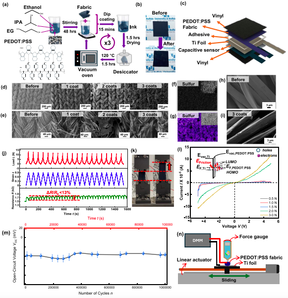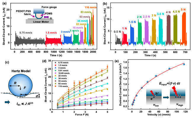 電學性能測試表明,織物在0%到90%應變區間的電阻變化率小于13%,表現出優良的力學穩定性與導電保持性。該織物與鈦金屬片在微米尺度接觸下形成類肖特基接觸,滑動引發局部摩擦電子激發,產生明顯的Tribovoltaic效應直流電輸出,其電壓與滑動速度成正相關關系。優異拉伸性能:應變達90%時電阻變化小于13%;同時,在摩擦界面選擇中,相比常用鋁片,選用了鈦(Ti)金屬片,更耐腐蝕、輸出穩定性更高(圖2H)。