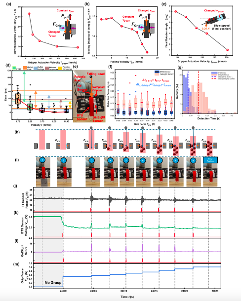 團隊進一步聚焦于系統在機器人抓取任務中的閉環控制表現。圖6A為BTS集成至機器人指腹的安裝方式,圖6B-C記錄了抓取物體過程中系統輸出電壓隨握持狀態的動態變化。在滑移發生初期(如圖5D所示),電壓迅速上升觸發反饋調節,圖6E-F顯示夾持力增強后滑移顯著抑制,滑動距離從初始的30 mm 降至約4.1 mm。圖6G統計了多個材質目標物在系統參與控制與否下的抓取成功率對比,進一步地,研究還基于赫茲接觸力學模型系統建立了輸出電壓信號與接觸力及滑動速度之間的數學映射關系,為后續構建更高級別的AI力控策略(如強化學習)提供了理論基礎,強化了BTS系統在閉環控制算法中的適配能力,證明該策略對多目標抓取的廣泛適應性與顯著增益。在多個物體搬運過程中,系統輸出的電信號可用于實時調節夾持力,顯著降低滑落率。尤其在面對材質柔軟或異形結構的目標物時,系統展現出優異的自適應能力與任務成功率。