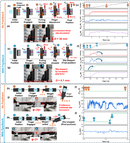 動態識別:毫秒級響應構建閉環反饋 BTS系統在滑動刺激下能迅速響應輸出電信號,其響應時間約為34 ms,快于人類RA類觸覺神經元以及當前GelSight視覺反饋系統(96 ms),更能滿足高速抓取中的滑動反饋需求。在模擬抓取實驗中,研究者對不同表面材質(如PVC、玻璃、紙板)施加恒壓滑動刺激,系統均能識別出滑動起始點與速度變化,并據此調整夾持力。 在“抓取-滑動-釋放”循環中,系統輸出信號可用于閉環控制指令。研究團隊構建了基于傳感輸出幅值的反饋調控模塊:當電壓高于閾值,反饋控制器自動增強夾持力,直至電壓回落至穩定狀態,實現對滑動趨勢的主動抑制。這種方式可使物體滑移距離從30 mm 降至4.1 mm,顯著提升抓取穩定性。 此外,系統在超過100萬次滑動循環實驗中表現出極高的耐久性與信號一致性,證明其適用于長時間、重復觸覺任務場景。 從仿生傳感到機器人控制閉環 更進一步,研究團隊基于BTS信號設計了閉環控制算法,將輸出信號(Vout)轉化為機器人夾持力調節信號,形成“檢測–計算–調整”的閉環調控機制,完成自主穩定抓握任務(圖3)。