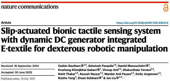 紐約州立大學布法羅分校劉駿教授團隊受人類觸覺神經元機制啟發,成功開發出一套全新的基于自驅動直流發電效應(Tribovoltaic Effect)的仿生滑動感應系統(BTS)。通過將動態直流發電機制引入柔性可穿戴電子織物中,成功構建出具有自供能能力、高靈敏滑動感知與實時反饋調控功能的仿生觸覺系統,在無需外部供電的前提下實現高靈敏度滑動檢測與反饋調節,系統響應時間可低至毫秒量級,遠優于視觸覺檢測原理。為未來智能機器人抓取、醫療輔助手和人機交互界面提供了全新思路。