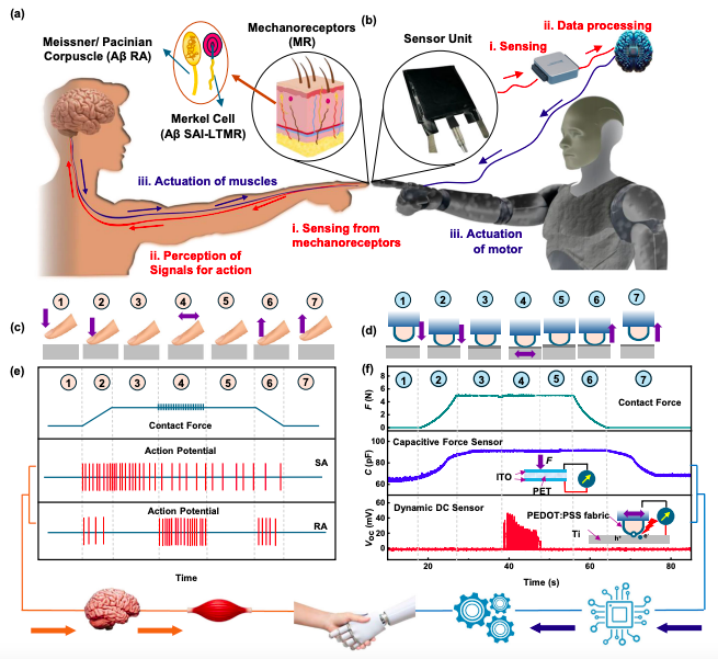 在機器人領域,如何實現“像人手一樣靈活靈活操作”一直是工程師與科學家的共同目標。尤其在滑動檢測、力控反饋等細微動作層面,傳統傳感器系統仍難以媲美人類的觸覺神經系統。即使利用最新的視覺控制技術,也不能比擬人類對切向“滑動”和縱向“壓力”變化的精確、快速多模態解析。重要原因在于,當前大多數人工觸覺系統無法具備人類皮膚的感受器(mechanoreceptor)功能(如Meissner/Pacinian 和 Merkel cell)對于動態與靜態刺激的分工同步應對。