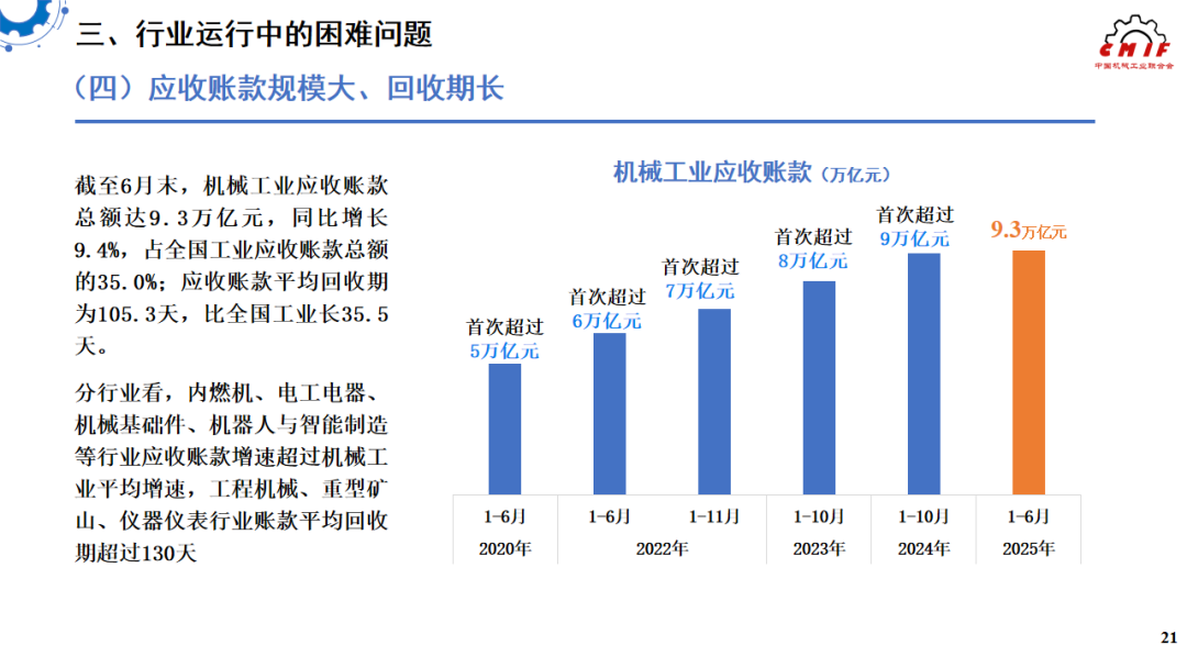 截至6月末,機械工業(yè)應(yīng)收賬款總額達9.3萬億元,同比增長9.4%,占全國工業(yè)應(yīng)收賬款總額的35.0%;應(yīng)收賬款平均回收期為105.3天,比全國工業(yè)長35.5天。分行業(yè)看,內(nèi)燃機、電工電器、機械基礎(chǔ)件、機器人與智能制造等行業(yè)應(yīng)收賬款增速超過機械工業(yè)平均增速,工程機械、重型礦山、儀器儀表行業(yè)賬款平均回收期超過130天。專項調(diào)查顯示,上半年53.4%的企業(yè)應(yīng)收賬款總額同比增長,42.5%的企業(yè)逾期應(yīng)收賬款同比增加,39.9%的企業(yè)應(yīng)收票據(jù)總額同比增長。