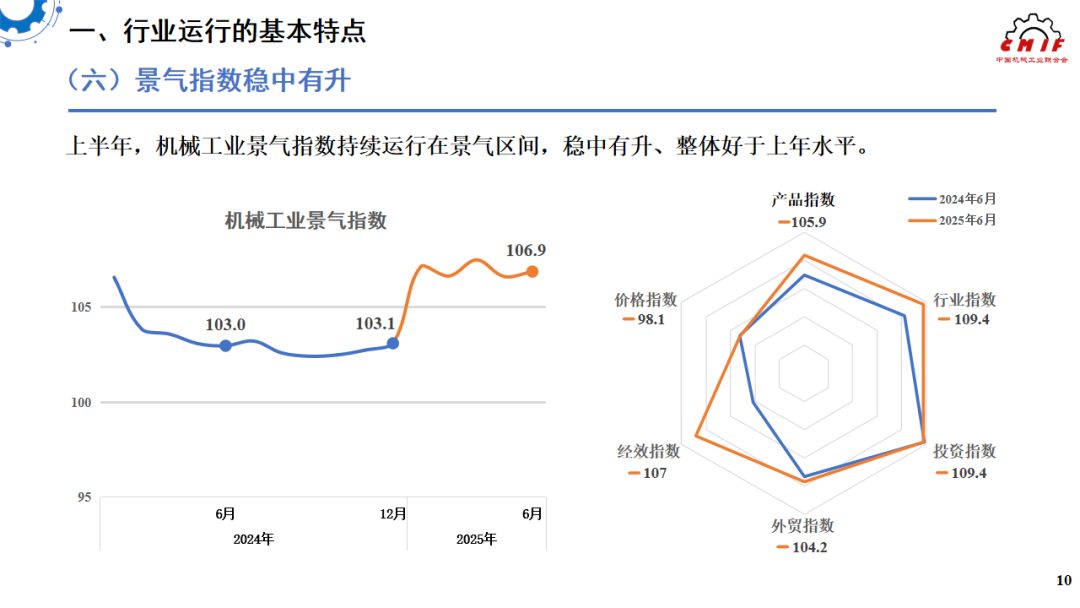 上半年機械工業(yè)景氣指數(shù)持續(xù)運行在景氣區(qū)間,穩(wěn)中有升、整體好于上年水平。6月份,機械工業(yè)景氣指數(shù)為106.9,比上年同期高3.9個點,表明行業(yè)經(jīng)濟運行總體穩(wěn)中向好。六個分類指數(shù)中有五個高于臨界值,其中,產(chǎn)品指數(shù)為105.9,高于上年同期3.5個點,反映生產(chǎn)端延續(xù)積極態(tài)勢;行業(yè)指數(shù)為109.4,高于上年同期3.9個點,反映行業(yè)發(fā)展繼續(xù)向好;投資指數(shù)為109.4,低于上年同期0.1個點,反映投資延續(xù)高位放緩態(tài)勢;外貿(mào)指數(shù)為104.2,高于上年同期0.9個點,反映在外部形勢嚴峻復(fù)雜、不確定性加大的情況下外貿(mào)表現(xiàn)出韌性;經(jīng)效指數(shù)為107.0,高于上年同期11.7個點,反映行業(yè)經(jīng)濟效益明顯改善。價格指數(shù)低于臨界值為98.1,且低于上年同期0.1個點,反映產(chǎn)品價格依然處于下行通道。
