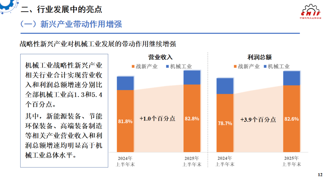 戰(zhàn)略性新興產(chǎn)業(yè)對機械工業(yè)發(fā)展的帶動作用繼續(xù)增強。上半年,機械工業(yè)戰(zhàn)略性新興產(chǎn)業(yè)相關(guān)行業(yè)合計實現(xiàn)營業(yè)收入和利潤總額增速分別比全部機械工業(yè)高1.3和5.4個百分點,占機械工業(yè)的比重分別達82.8%和82.6%,占比較上年同期分別提高1和3.9個百分點。其中,新能源裝備、節(jié)能環(huán)保裝備、高端裝備制造等相關(guān)產(chǎn)業(yè)營業(yè)收入和利潤總額增速均明顯高于機械工業(yè)總體水平。