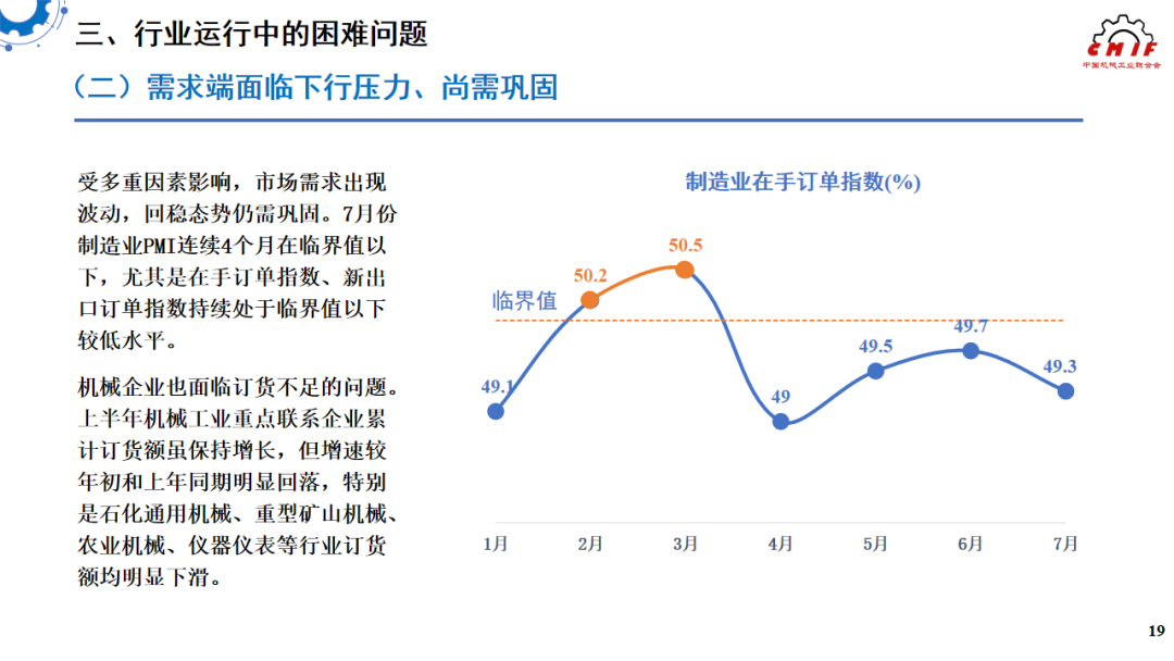 受多重因素影響,市場需求出現(xiàn)波動,回穩(wěn)態(tài)勢仍需鞏固。7月份制造業(yè)PMI連續(xù)4個月在臨界值以下,尤其是在手訂單指數(shù)、新出口訂單指數(shù)持續(xù)處于臨界值以下較低水平。機械企業(yè)也面臨訂貨不足的問題。上半年機械工業(yè)重點聯(lián)系企業(yè)累計訂貨額雖保持增長,但增速較年初和上年同期明顯回落,特別是石化通用機械、重型礦山機械、農(nóng)業(yè)機械、儀器儀表等行業(yè)訂貨額均明顯下滑。專項調(diào)查中66%的企業(yè)反饋存在訂單不足的問題,在手訂單增速回落、短單居多、出口訂單收縮的趨勢均進一步加劇。