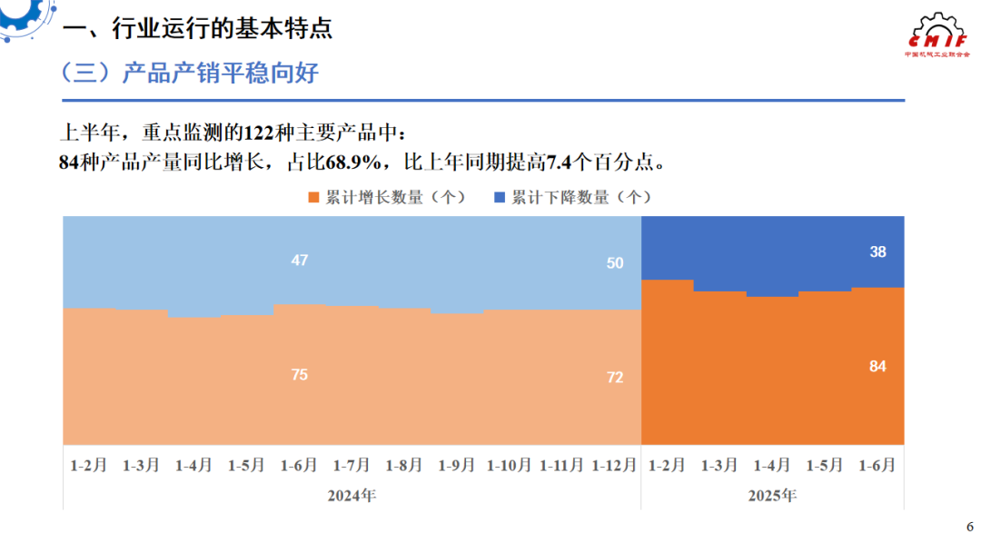 在存量政策與新一輪“兩新”政策加力擴圍疊加效應(yīng)下,國內(nèi)市場需求改善,帶動機械工業(yè)產(chǎn)銷形勢整體好于上年。上半年,重點監(jiān)測的122種主要產(chǎn)品中,84種產(chǎn)品產(chǎn)量同比增長,占比68.9%,比上年同期提高7.4個百分點;38種產(chǎn)品產(chǎn)量同比下降,占比31.1%。