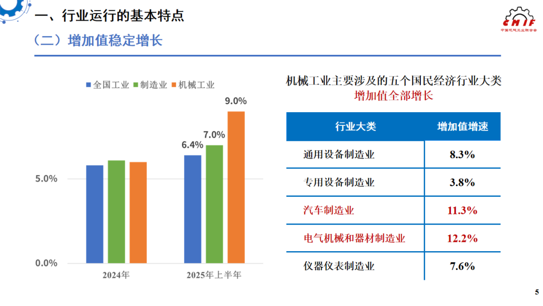 國家統(tǒng)計局數(shù)據(jù)顯示,一季度機械工業(yè)經(jīng)濟運行開局良好、態(tài)勢積極,二季度受美國關(guān)稅政策等外部因素擾動,行業(yè)運行有所波動但總體保持穩(wěn)定、展現(xiàn)韌性。上半年機械工業(yè)主要經(jīng)濟指標較快增長,為實現(xiàn)全年目標打下了良好基礎(chǔ)。