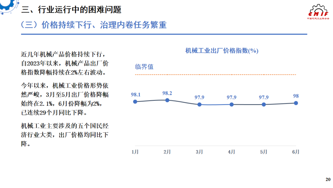 展望下半年,機械工業(yè)仍面臨不少風(fēng)險挑戰(zhàn),內(nèi)需不足、外需不穩(wěn)。從外部看,國際環(huán)境總體趨緊,地緣政治沖突頻發(fā),關(guān)稅博弈加劇,貿(mào)易不確定性加大。全球經(jīng)濟增速下行,國際市場需求收縮,國際組織紛紛下調(diào)全球經(jīng)濟和全球貿(mào)易增長預(yù)期。美國挑起的貿(mào)易戰(zhàn)仍在不斷演變中,后期中美雙方關(guān)稅走勢及美國對其他貿(mào)易體的關(guān)稅政策均存在較強不確定性。從國內(nèi)看,外部環(huán)境變化帶來的不利影響增多,市場出現(xiàn)波動、有效需求不足、外貿(mào)出口承壓,部分產(chǎn)業(yè)結(jié)構(gòu)性矛盾凸顯,價格內(nèi)卷壓縮利潤空間,賬款回收難加大經(jīng)營壓力,部分企業(yè)經(jīng)營困難。