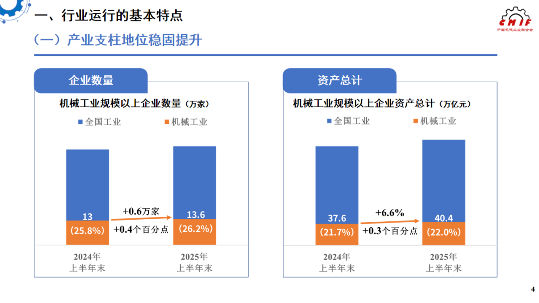 截至6月末,機械工業(yè)規(guī)模以上企業(yè)數(shù)量達13.6萬家,較上年同期增加0.6萬家,占全國工業(yè)的26.2%,占比較上年同期提高0.4個百分點;資產(chǎn)總計達40.4萬億元,同比增長6.6%,占全國工業(yè)的22.0%,占比較上年同期提高0.3個百分點。