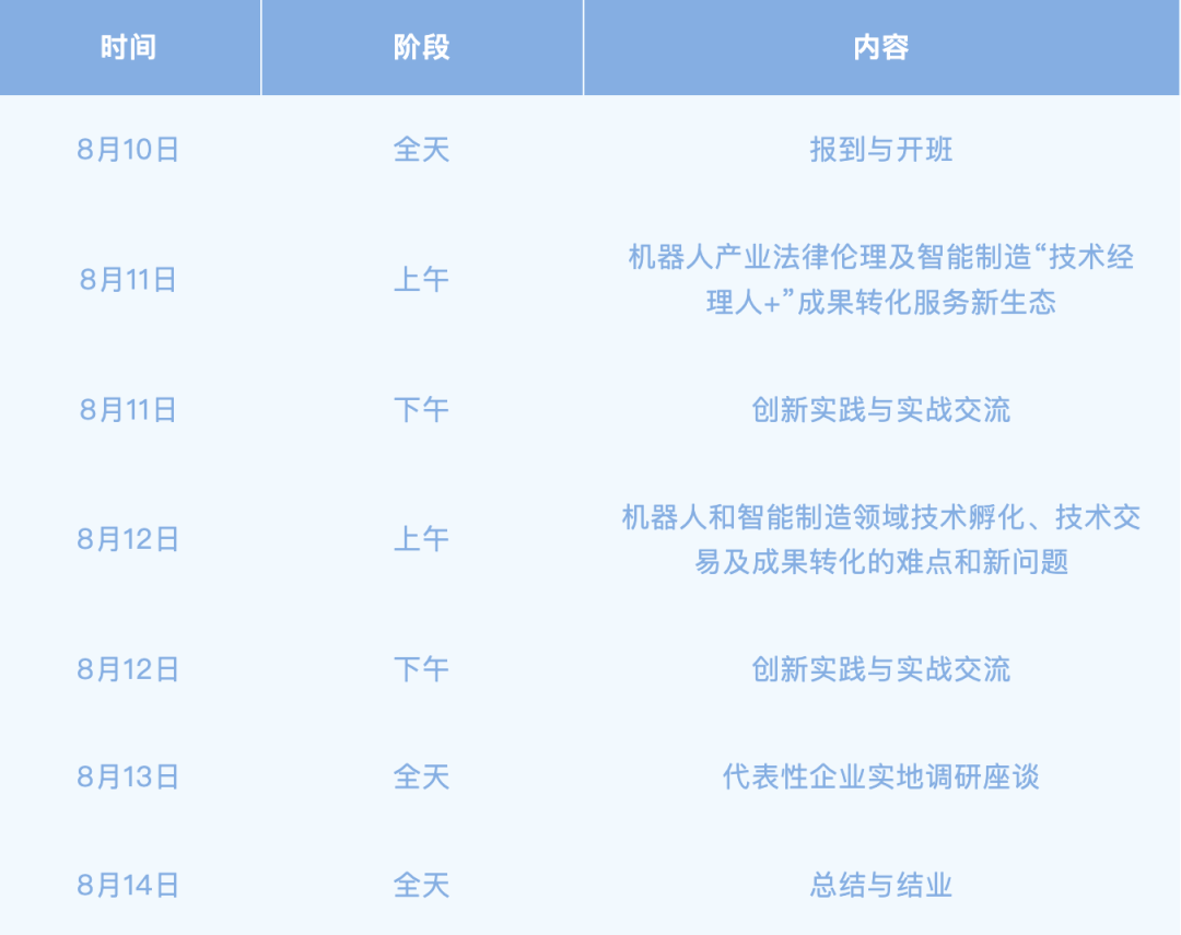 二、時間及地點 時間:2025年8月10日—2025年8月14日(8月10日報到開班,8月14日結業,共計5天) 地點:北京經濟技術開發區 三、研修內容 (一)研修班名稱 專業技術人才知識更新工程2025年高級研修項目-先進機器人及智能制造領域技術轉移轉化高級研修班 (二)研修方向 本屆高研班研修擬定內容包含但不限于以下方向:產業政策與方向前瞻;技術創新與場景應用;技術成果轉移轉化;企業走訪與現場案例教學等。 四、研修對象