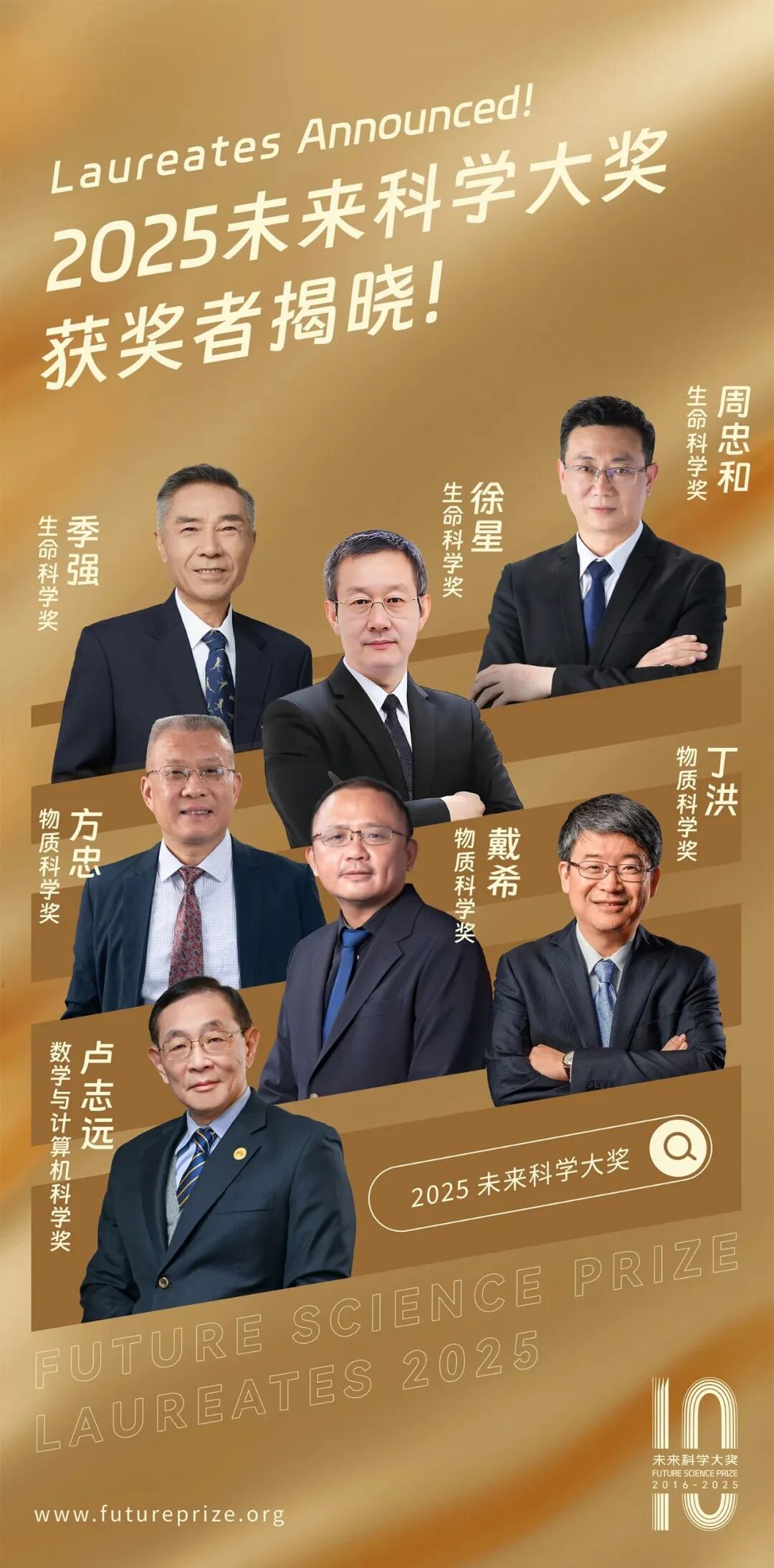 季強、徐星、周忠和獲得“生命科學獎”;方忠、戴希、丁洪獲得“物質科學獎”;盧志遠獲得“數(shù)學與計算機科學獎”。