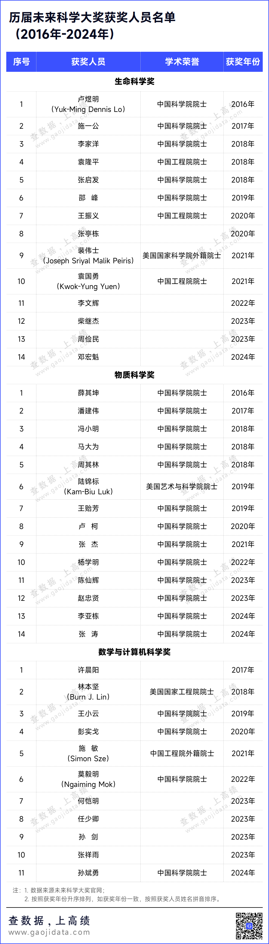 2016年到2024年,未來科學大獎共評選出39位獲獎者,獲得了國內外科學界和社會民眾的廣泛認可。他們分別是: