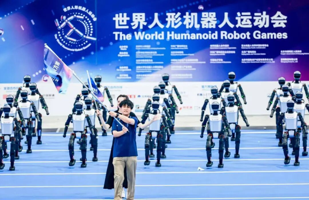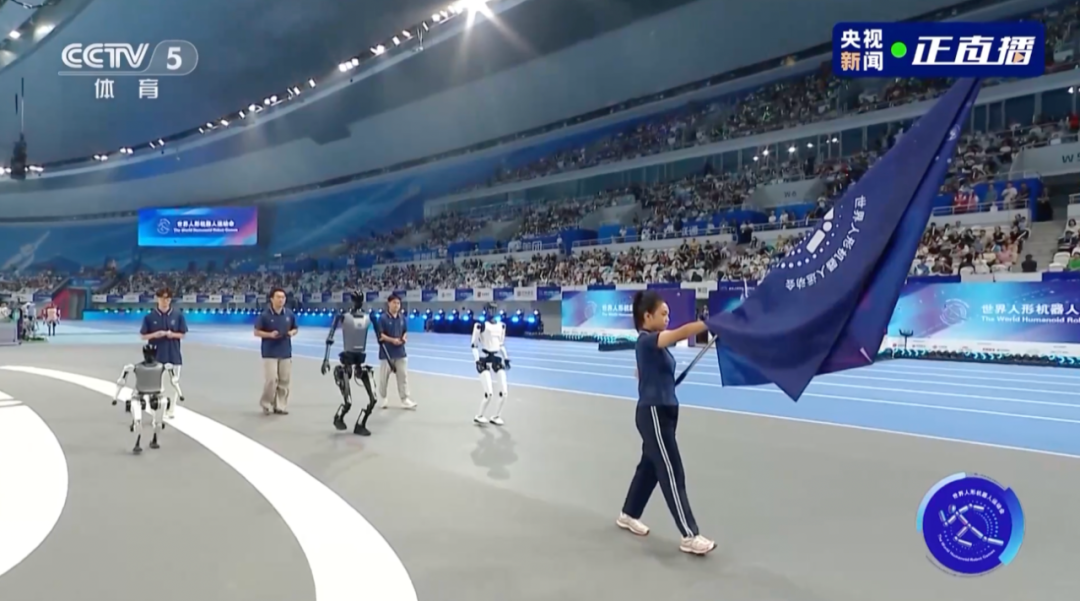 會旗入場環(huán)節(jié),年僅14歲的參賽工程師于程程手持由0和1組成主體圖形的會旗,攜手三名機器人護旗手共同步入會場,它們是全球首個人形機器人半程馬拉松的冠亞季軍獲得者,分別是天工ultra、松延動力N2以及卓益得行者二號。
