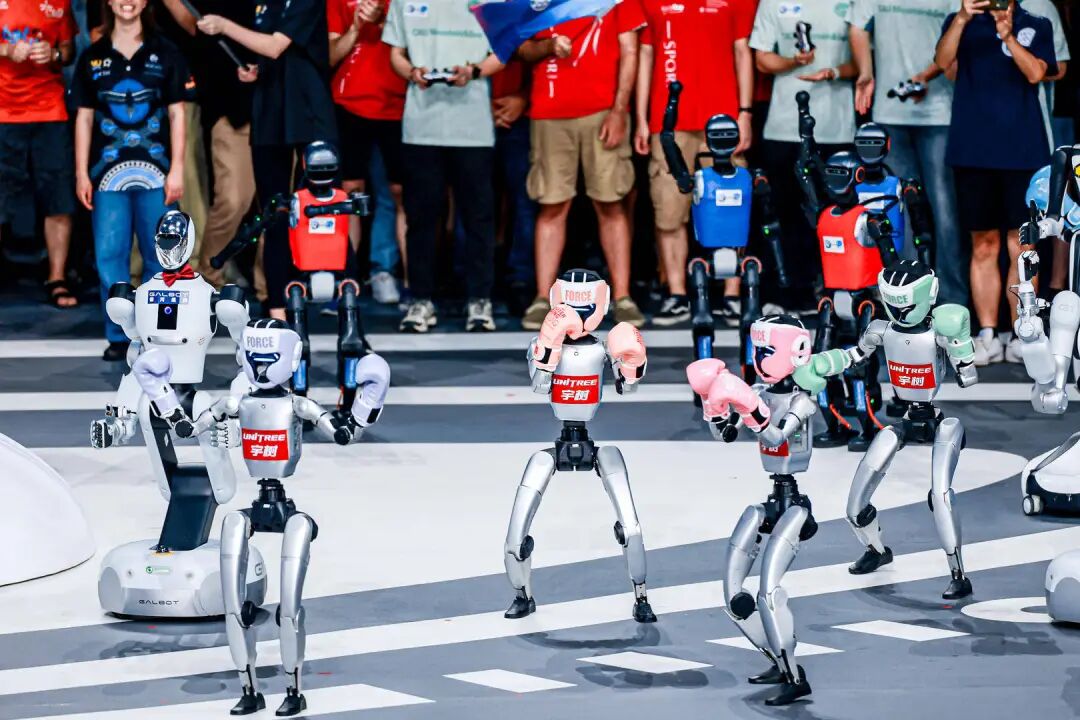 加速進化T1方陣、宇樹科技Unitree G1方陣邁出精準步伐,同步入場的還有奧運健兒張琳、李洋、薛明、常思、楊秀麗、劉哮波。本屆賽事中,機器人運動員們將在田徑、足球、自由搏擊等項目中展示中國智造對速度與智慧的深度融合。