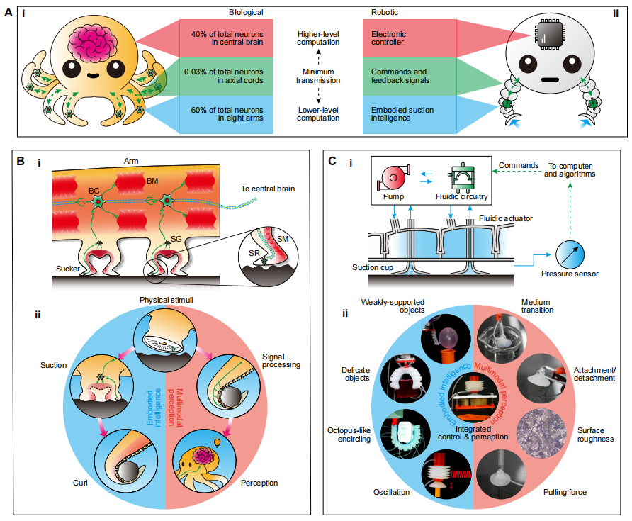 受章魚吸盤及其神經(jīng)肌肉層級結(jié)構(gòu)的啟發(fā),南方科技大學(xué)與英國布里斯托大學(xué)合作開發(fā)了一種具有自主智能與多模態(tài)感知能力的軟體機(jī)器人系統(tǒng)。