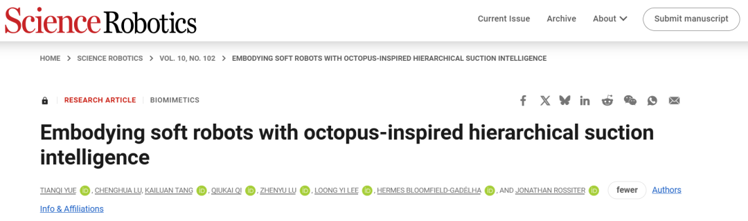 1.Yue Tianqi et al. Embodying soft robots with octopus-inspired hierarchical suction intelligence. Science Robotics 10, 102(2025). DOI: 10.1126/scirobotics.adr4264