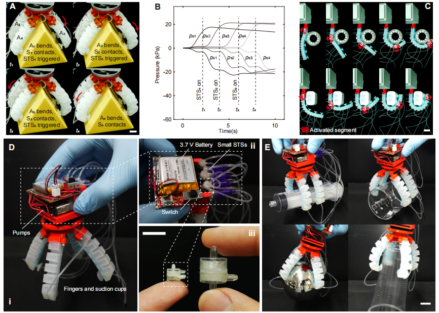 其創(chuàng)新性體現(xiàn)在高層決策與底層控制的有機(jī)結(jié)合:底層依靠機(jī)械本體特性實現(xiàn)無意識響應(yīng),如吸附觸發(fā)自主收縮;高層則借助單通道氣壓信號進(jìn)行算法解析,實現(xiàn)多模態(tài)感知,包括判斷物體重量、表面粗糙度及干濕狀態(tài)等。