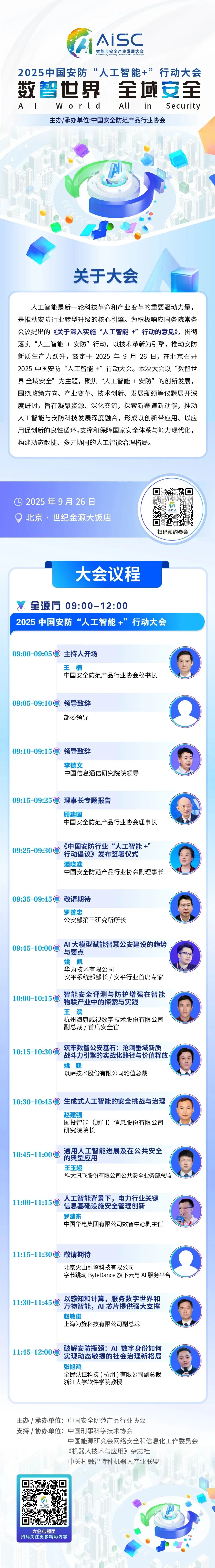 人工智能是新一輪科技革命和產業變革的重要驅動力量,是推動安防行業轉型升級的核心引擎。為積極響應國務院《關于深入實施“人工智能+”行動的意見》,進一步落實“人工智能+安防”行動,以技術革新為引擎,推動安防新質生產力躍升,中國安全防范產品行業協會定于9月26日在北京世紀金源大飯店召開2025中國安防“人工智能+”行動大會,同期舉辦2025低空安全產業發展大會暨第三屆中國安防無人系統安全高峰論壇和2025智能機器人與公共安全創新發展論壇。大會以“數智世界 全域安全”為主題,聚焦“人工智能+安防”的創新發展,圍繞政策方向、產業變革、技術創新、發展瓶頸等議題展開深度研討,旨在凝聚資源、深化交流,探索新賽道新動能,推動人工智能與安防科技發展深度融合。