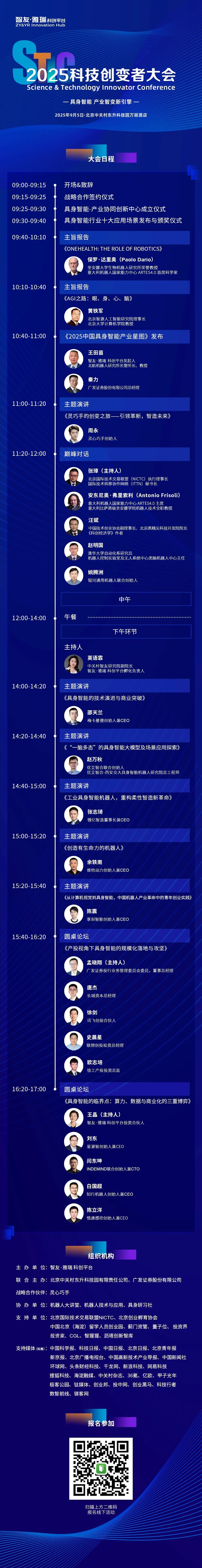 “2025科技創變者大會”包含頒獎儀式、報告發布、主旨報告、巔峰對話、圓桌論壇、主題演講等環節,影響力輻射具身智能全產業鏈。從宏觀趨勢到微觀案例,從技術創新跨越到商業落地實戰,從前瞻研判延展到戰略管理......一批活躍在具身智能領域的“頂流”,將在這里交流經驗,分享智慧。