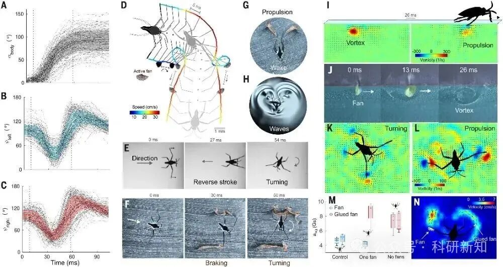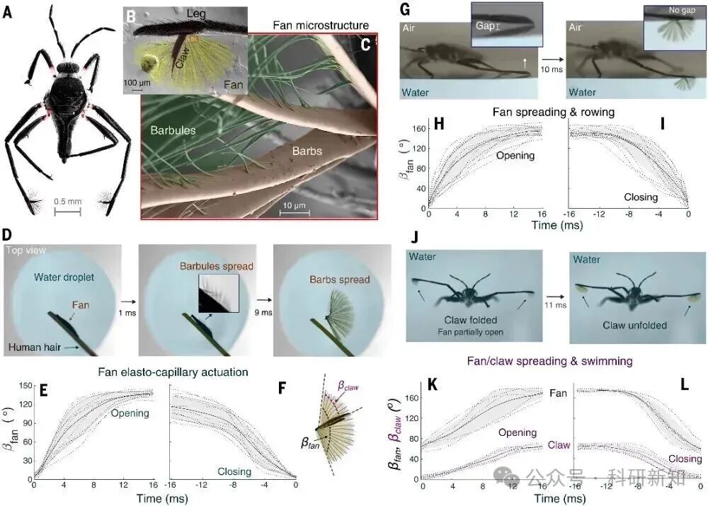 漣漪蟲利用其中足末端的扁平帶狀結構彈性扇在急流表面行進。研究表明,該扇狀結構的方向性剛度能夠實現快速、被動的彈性毛細形態變化,且這一過程無需肌肉參與。這種扁平帶狀扇片在腿部回撤階段保持可折疊性,而在拖曳式推進階段維持剛性,使其能在50毫秒內完成96度的全身轉向,最高前進速度達120體長/秒——與果蠅空中急轉能力相當。